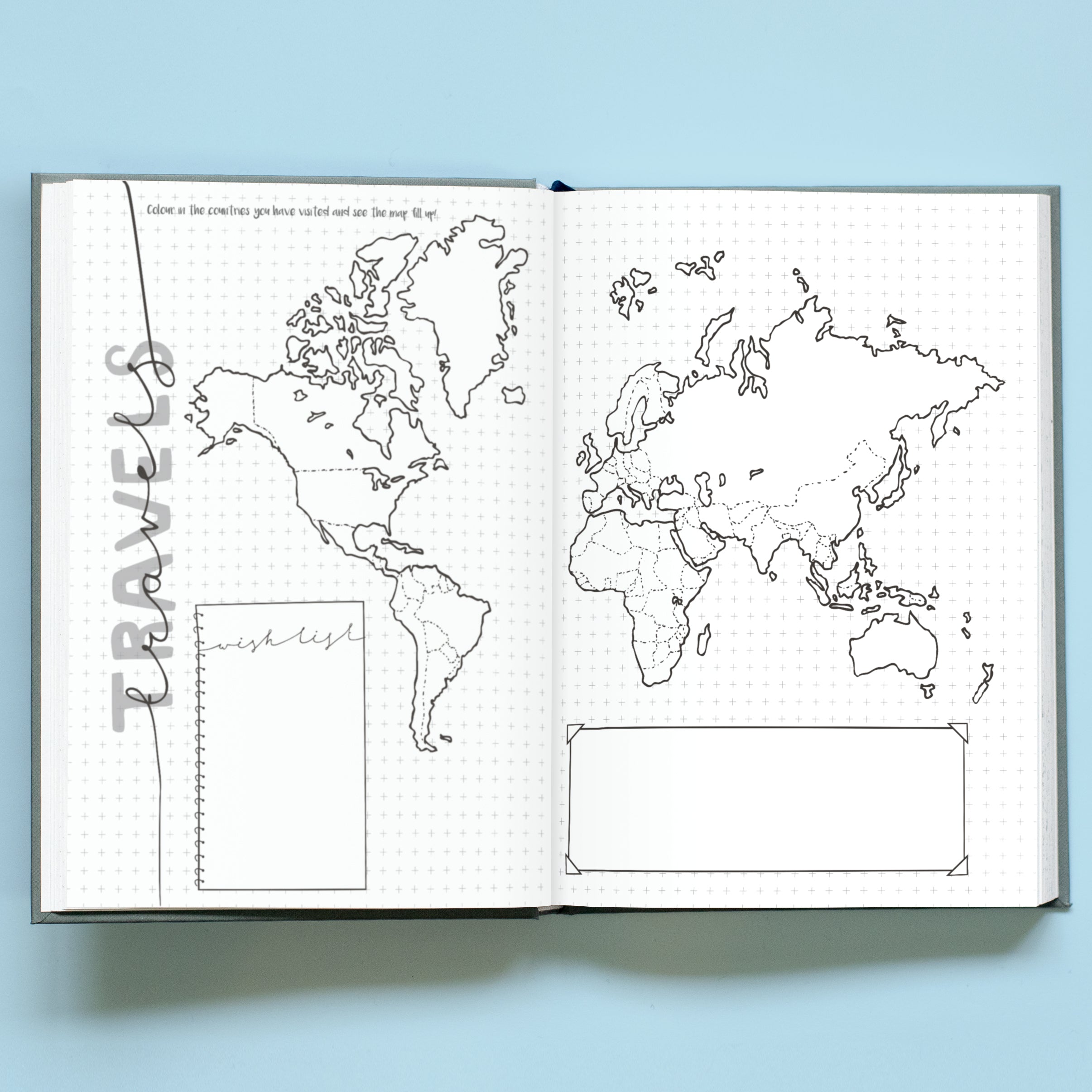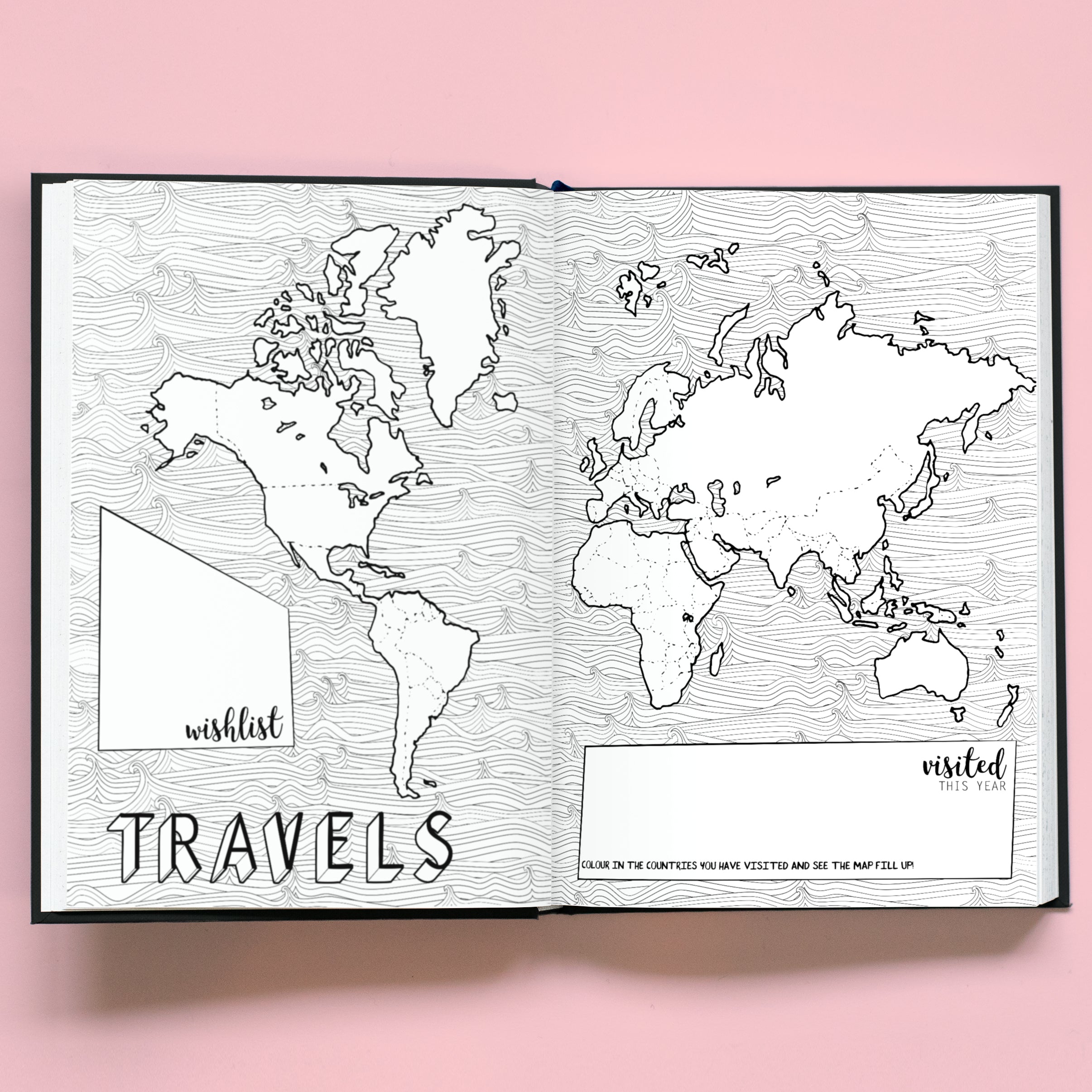 Monthly and weekly calendars, monthly mood trackers, weekly habit tracking, travel journal.
